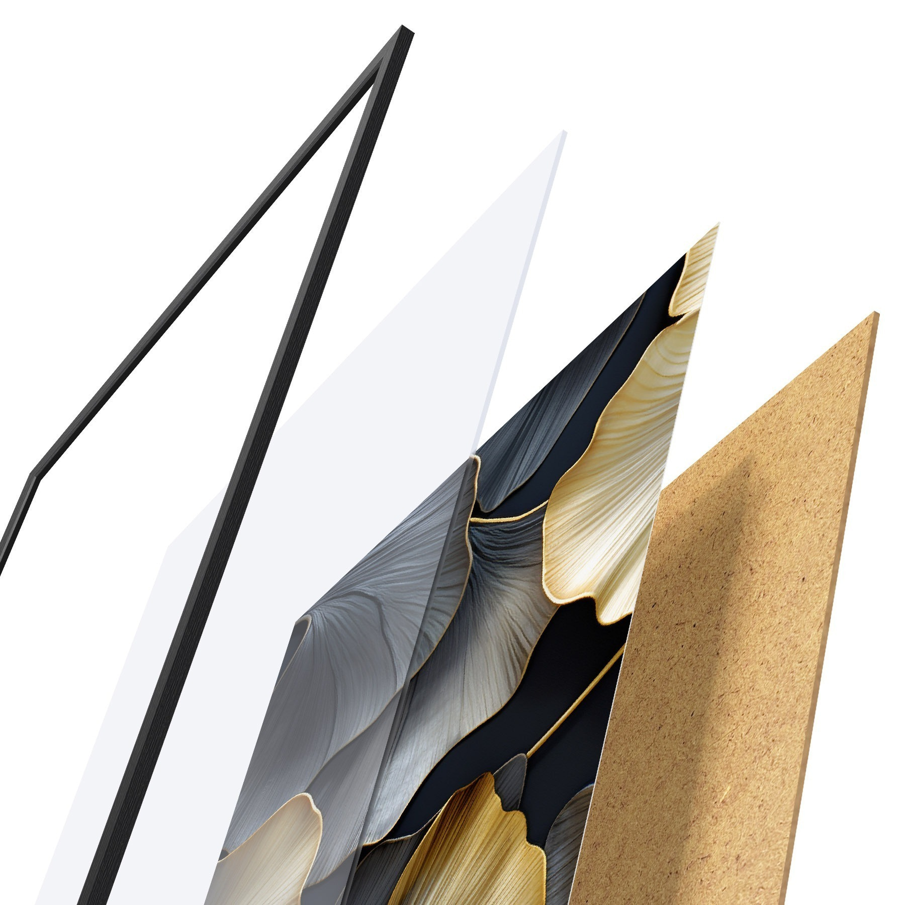 Das Poster besteht aus einem Rahmen, Plexiglas, einem gedruckten Bild und einer Rückwand aus Spanplatten. Dank der Halterungen auf der Rückseite kann das Poster sofort an die Wand gehängt werden.