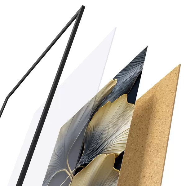 Das Poster besteht aus einem Rahmen, Plexiglas, einem gedruckten Bild und einer Rückwand aus Spanplatten. Dank der Halterungen auf der Rückseite kann das Poster sofort an die Wand gehängt werden.