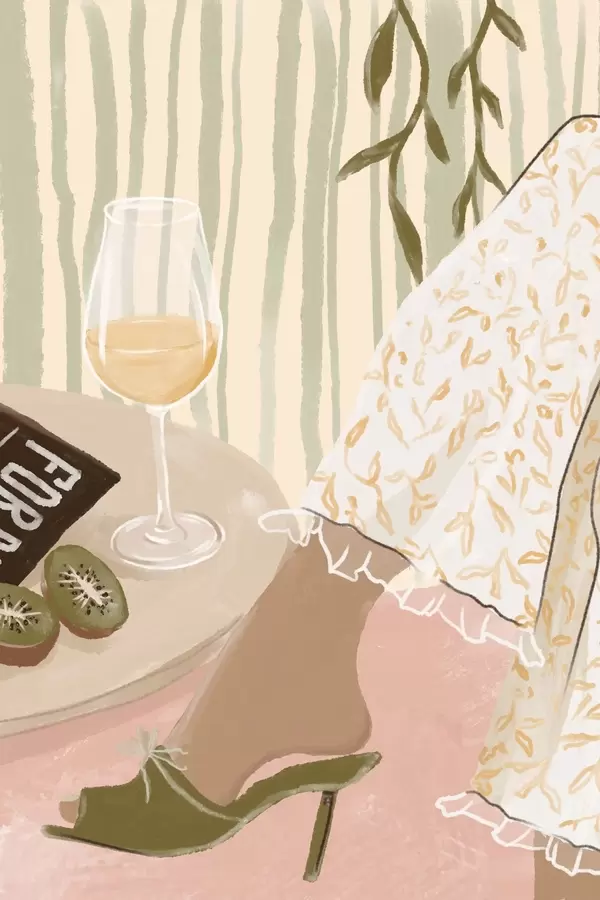Poster Tisch mit Weinglas und Kiwi neben Kleid f48021