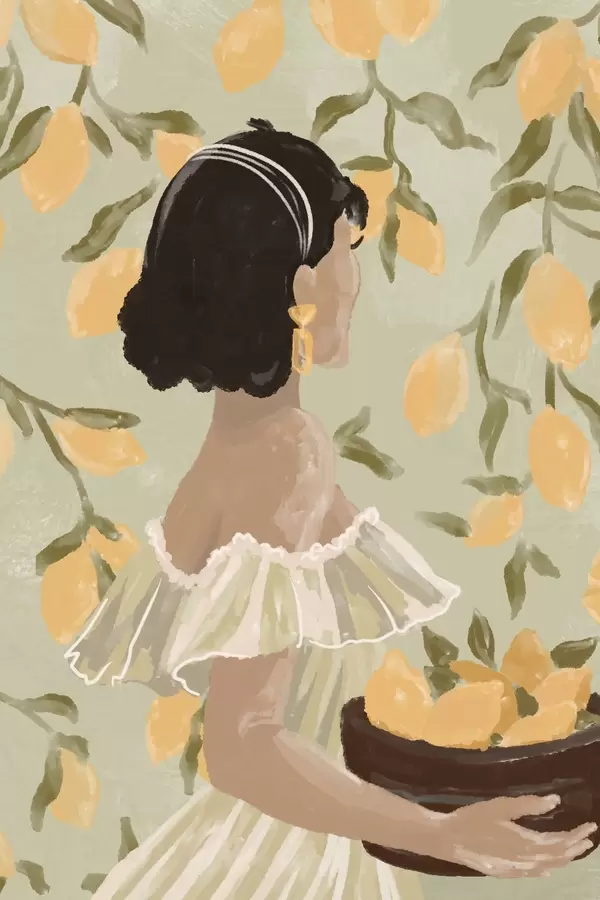 Poster Frau hält eine Schüssel mit Zitronen an den Zweigen f48023