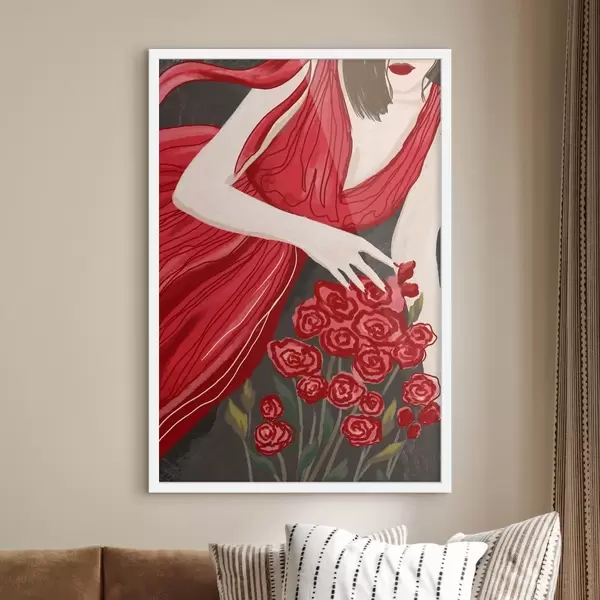 Poster Frau in rotem Kleid mit Rosenstrauß f48026
