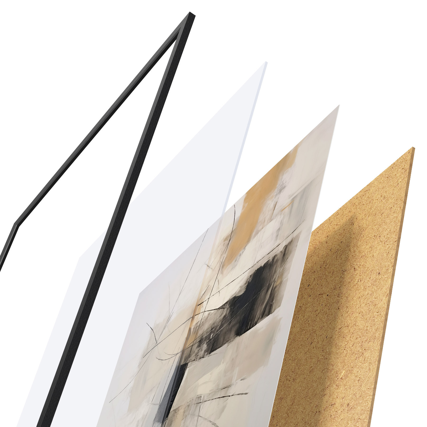 Das Poster besteht aus einem Rahmen, Plexiglas, einem gedruckten Bild und einer Rückwand aus Spanplatten. Dank der Halterungen auf der Rückseite kann das Poster sofort an die Wand gehängt werden.
