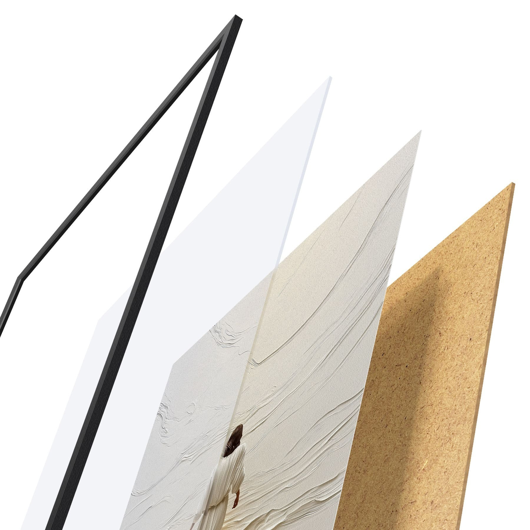 Das Poster besteht aus einem Rahmen, Plexiglas, einem gedruckten Bild und einer Rückwand aus Spanplatten. Dank der Halterungen auf der Rückseite kann das Poster sofort an die Wand gehängt werden.
