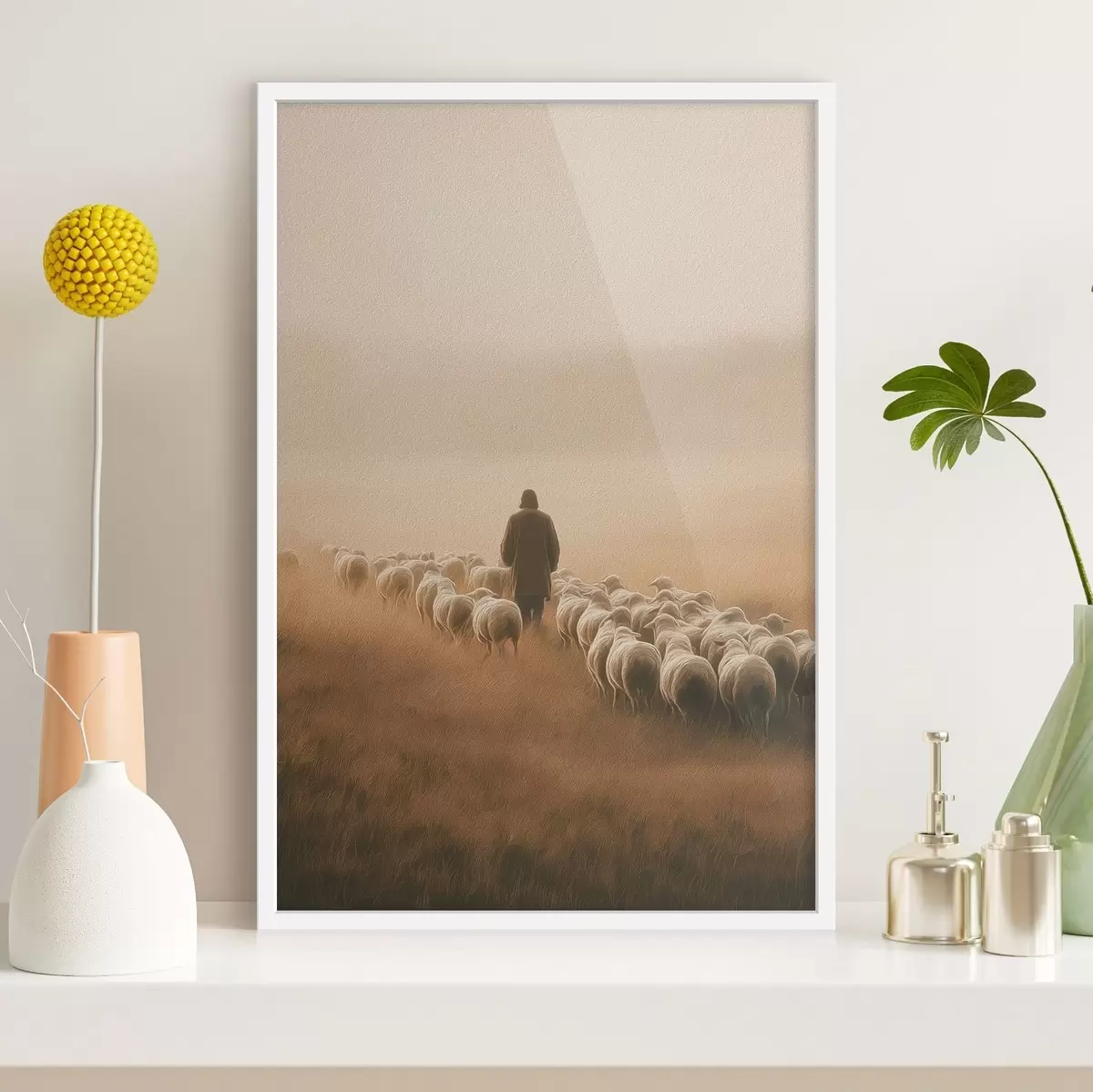 Poster Hirte, der mit seiner Schafherde auf einer offenen Weide spazieren geht Nr f48077