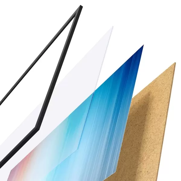 Das Poster besteht aus einem Rahmen, Plexiglas, einem gedruckten Bild und einer Rückwand aus Spanplatten. Dank der Halterungen auf der Rückseite kann das Poster sofort an die Wand gehängt werden.