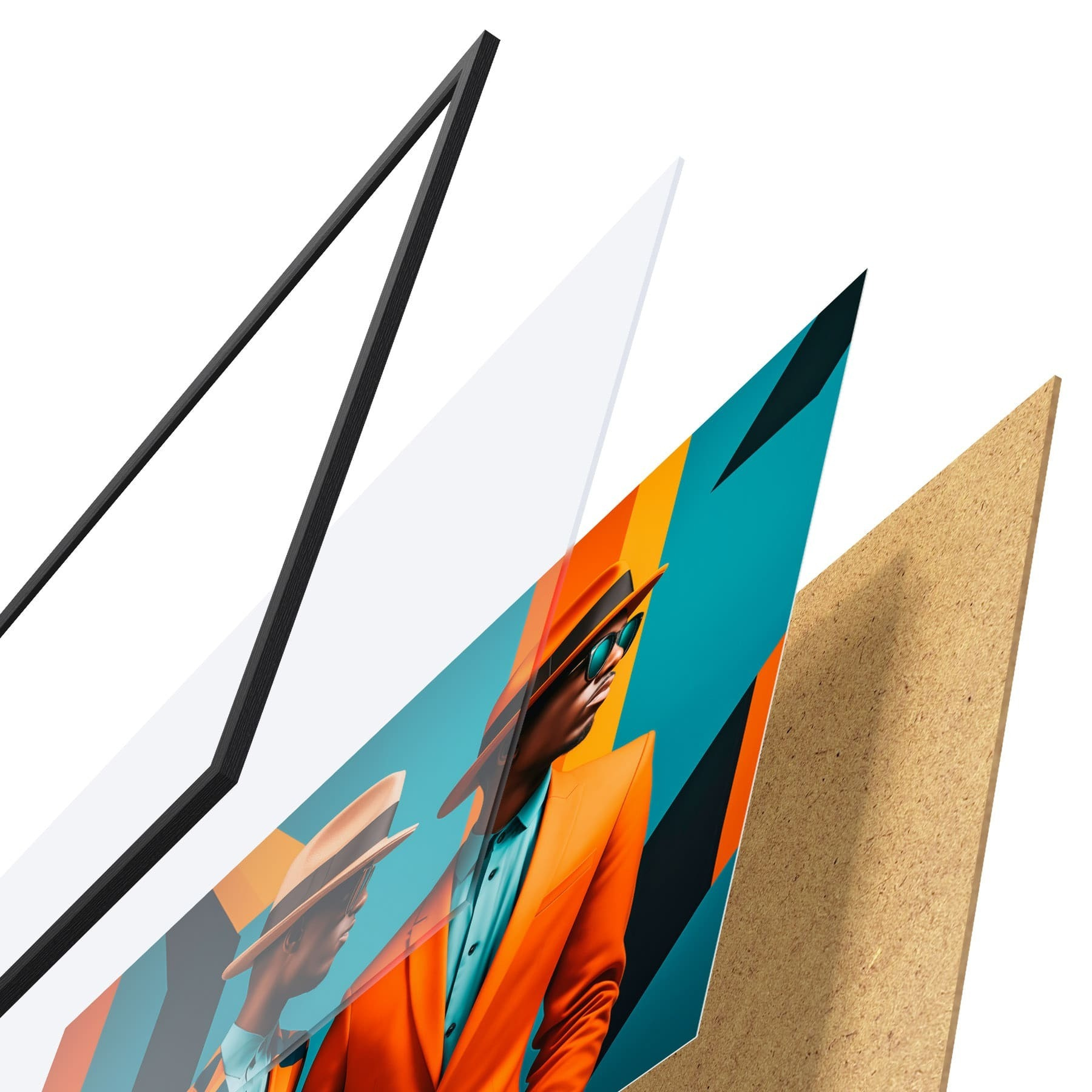 Das Poster besteht aus einem Rahmen, Plexiglas, einem gedruckten Bild und einer Rückwand aus Spanplatten. Dank der Halterungen auf der Rückseite kann das Poster sofort an die Wand gehängt werden.