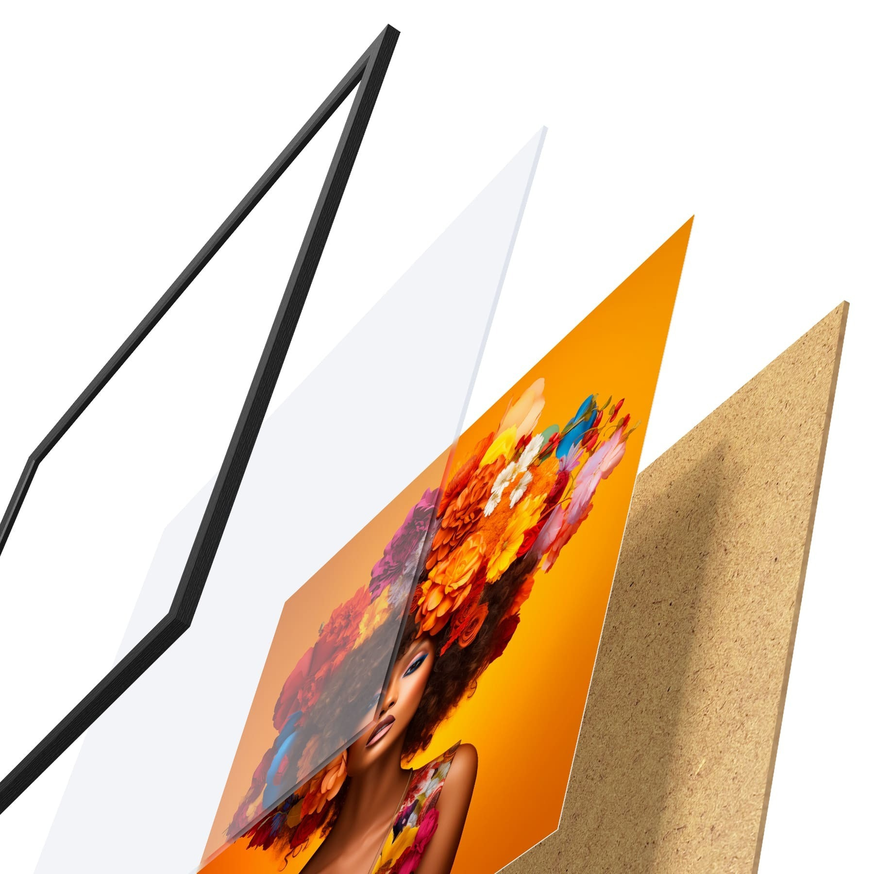 Das Poster besteht aus einem Rahmen, Plexiglas, einem gedruckten Bild und einer Rückwand aus Spanplatten. Dank der Halterungen auf der Rückseite kann das Poster sofort an die Wand gehängt werden.