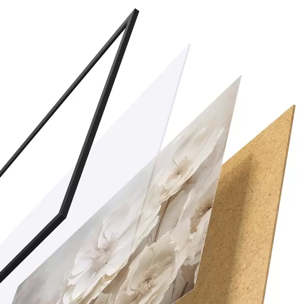 Das Poster besteht aus einem Rahmen, Plexiglas, einem gedruckten Bild und einer Rückwand aus Spanplatten. Dank der Halterungen auf der Rückseite kann das Poster sofort an die Wand gehängt werden.