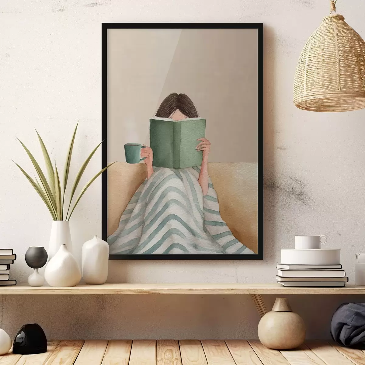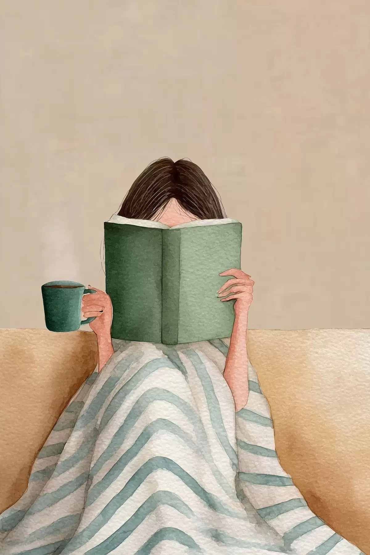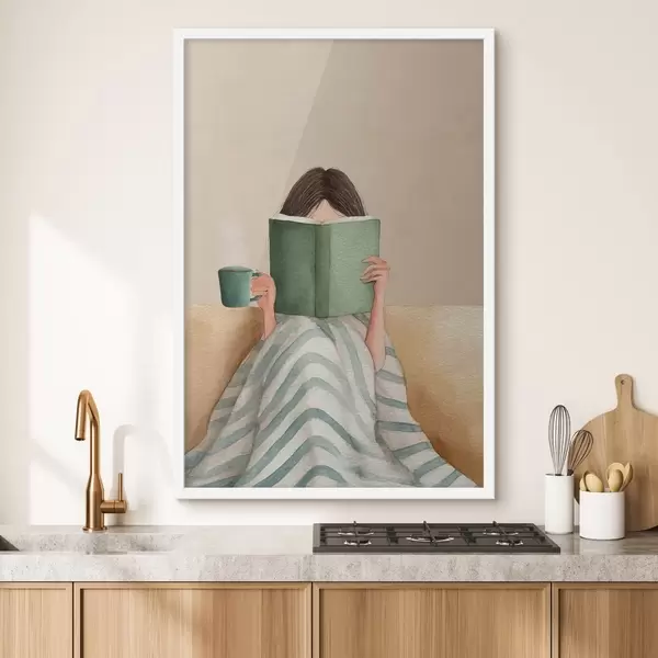 Poster Weiche Aquarellillustration einer Frau, die auf einer Couch sitzt und ein Buch liest Nr f48114