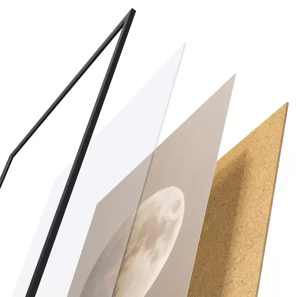 Das Poster besteht aus einem Rahmen, Plexiglas, einem gedruckten Bild und einer Rückwand aus Spanplatten. Dank der Halterungen auf der Rückseite kann das Poster sofort an die Wand gehängt werden.