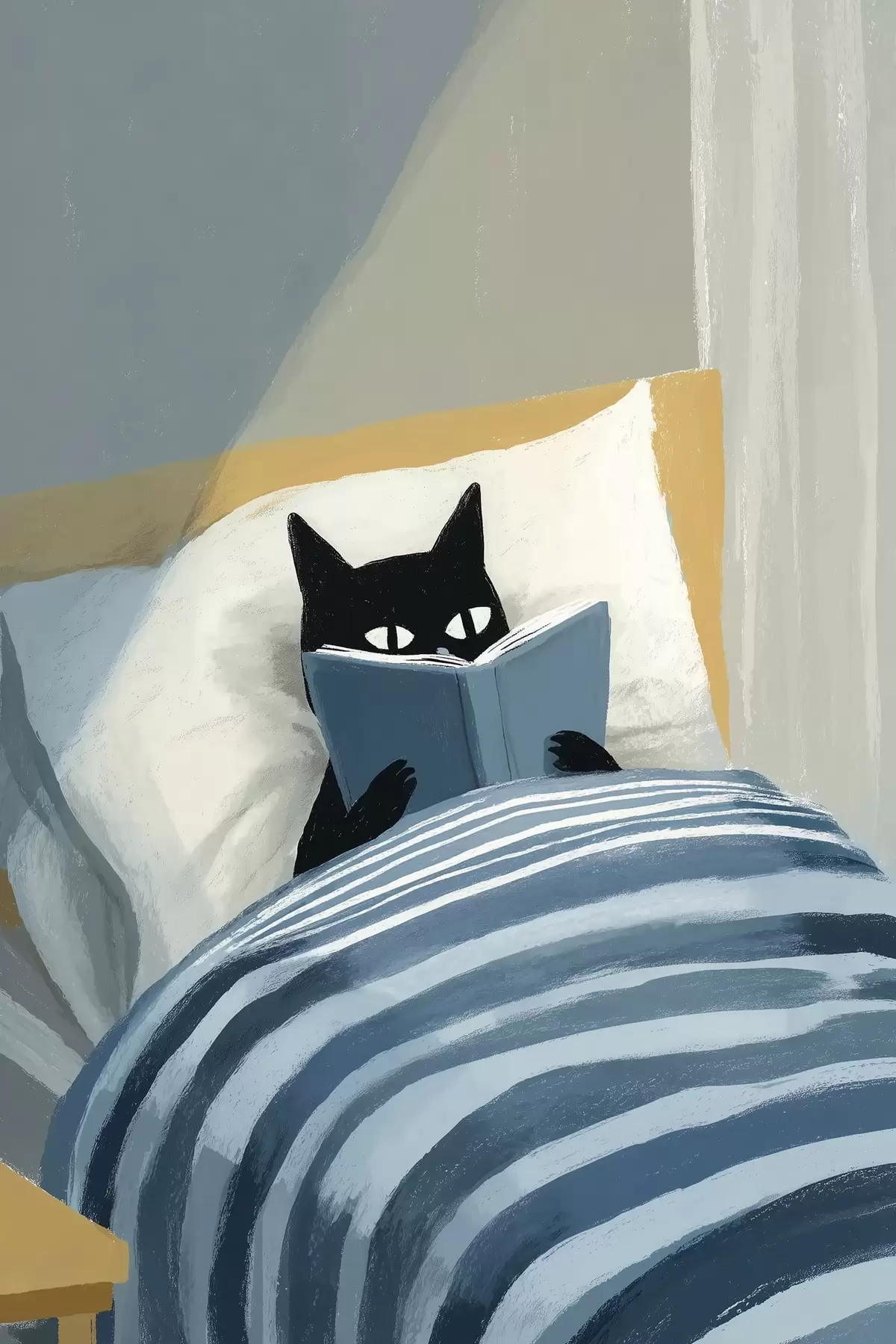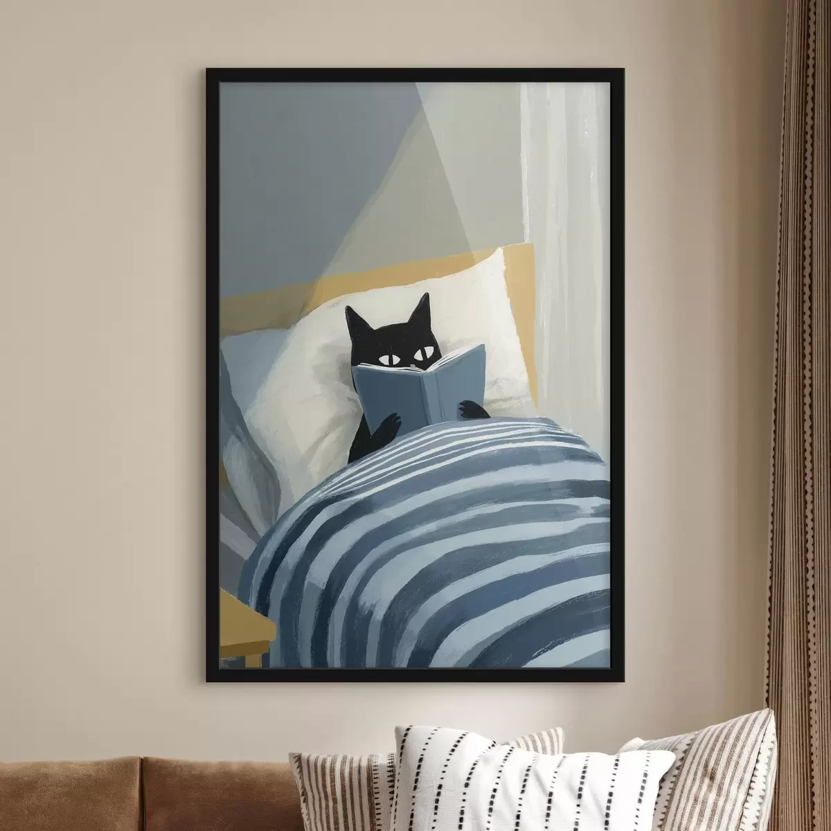 Poster Minimale flache Illustration einer schwarzen Katze, die im Bett ein Buch liest Nr f48117