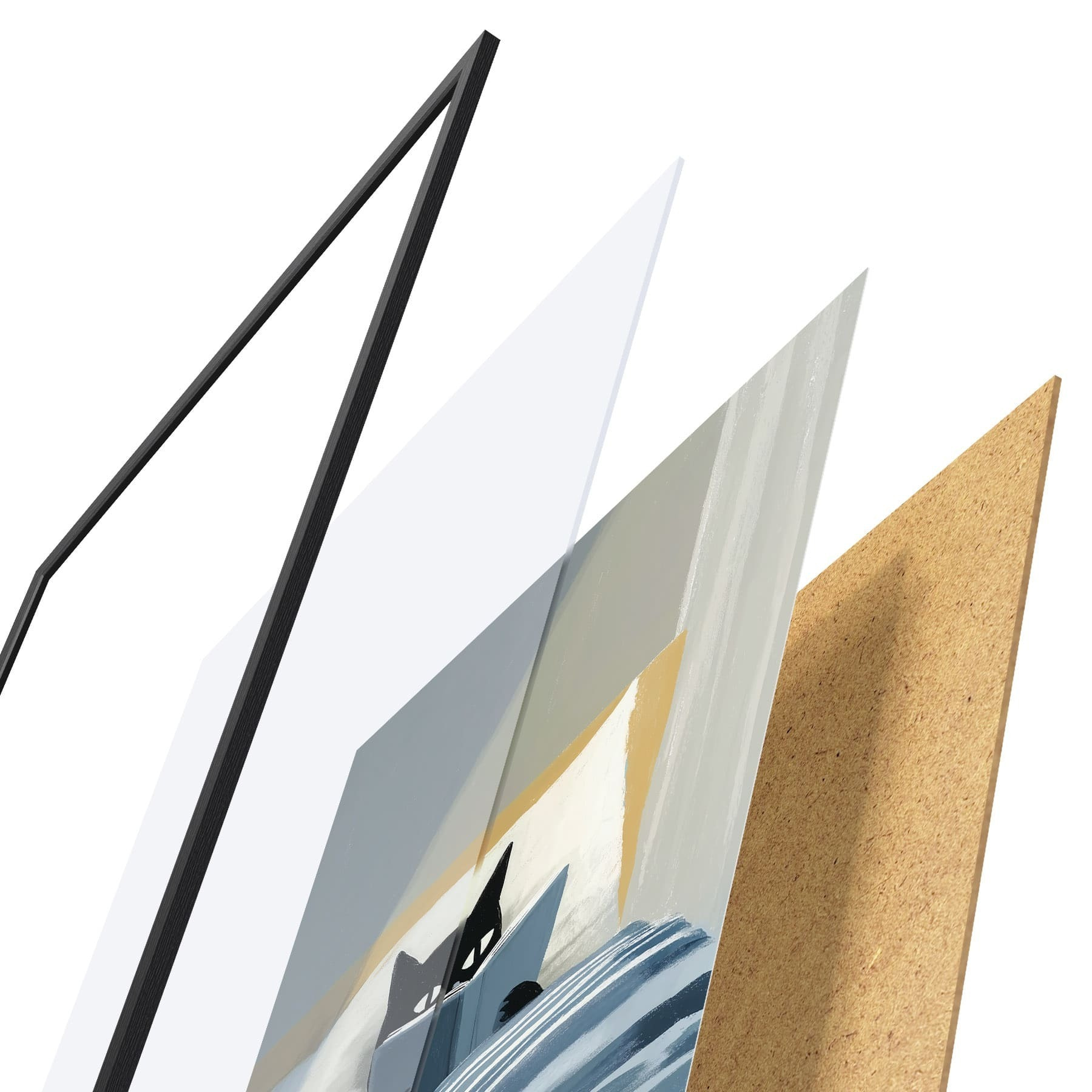 Das Poster besteht aus einem Rahmen, Plexiglas, einem gedruckten Bild und einer Rückwand aus Spanplatten. Dank der Halterungen auf der Rückseite kann das Poster sofort an die Wand gehängt werden.