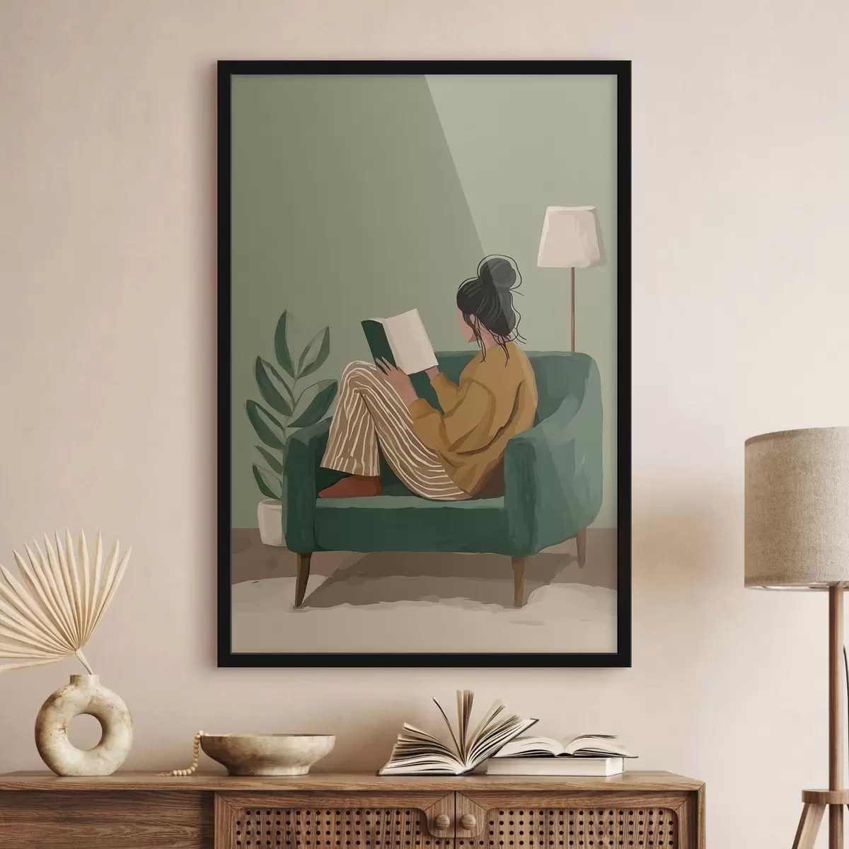 Poster Minimalistische, gemütliche Illustration einer Frau, die in einem Sessel sitzt und liest Nr f48118