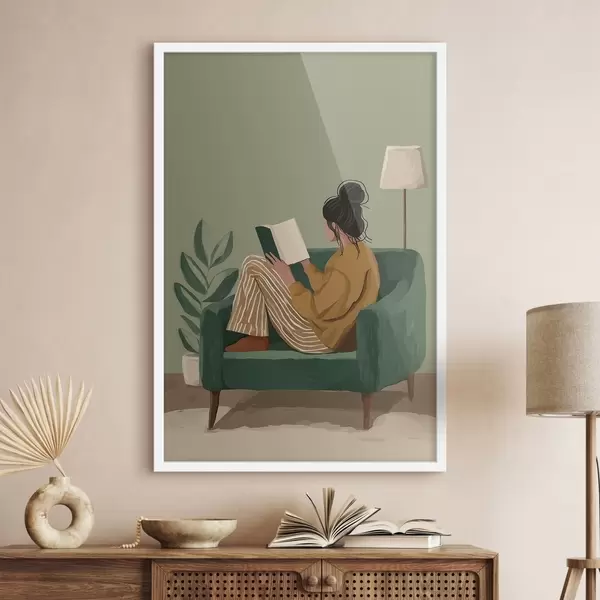 Poster Minimalistische, gemütliche Illustration einer Frau, die in einem Sessel sitzt und liest f48118