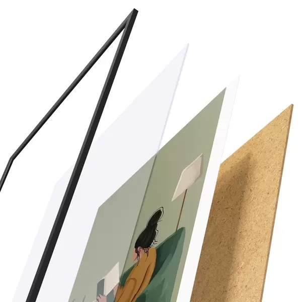Das Poster besteht aus einem Rahmen, Plexiglas, einem gedruckten Bild und einer Rückwand aus Spanplatten. Dank der Halterungen auf der Rückseite kann das Poster sofort an die Wand gehängt werden.