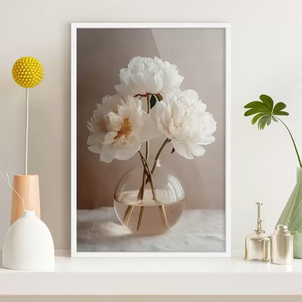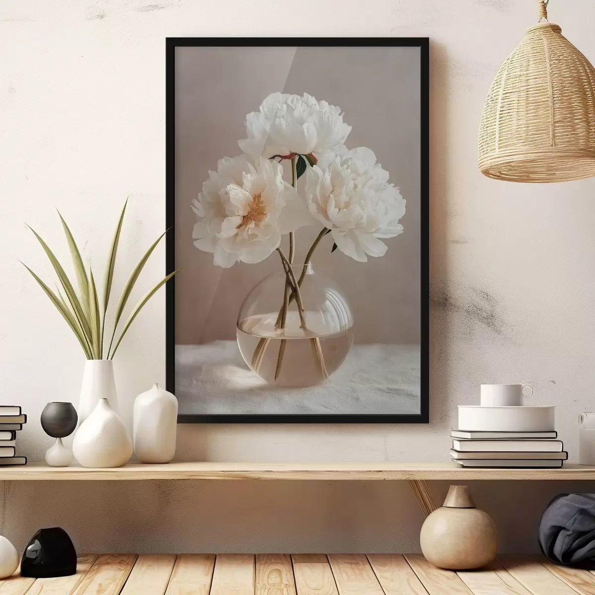 Poster Luftiges, minimalistisches Stillleben mit Pfingstrosen f48119