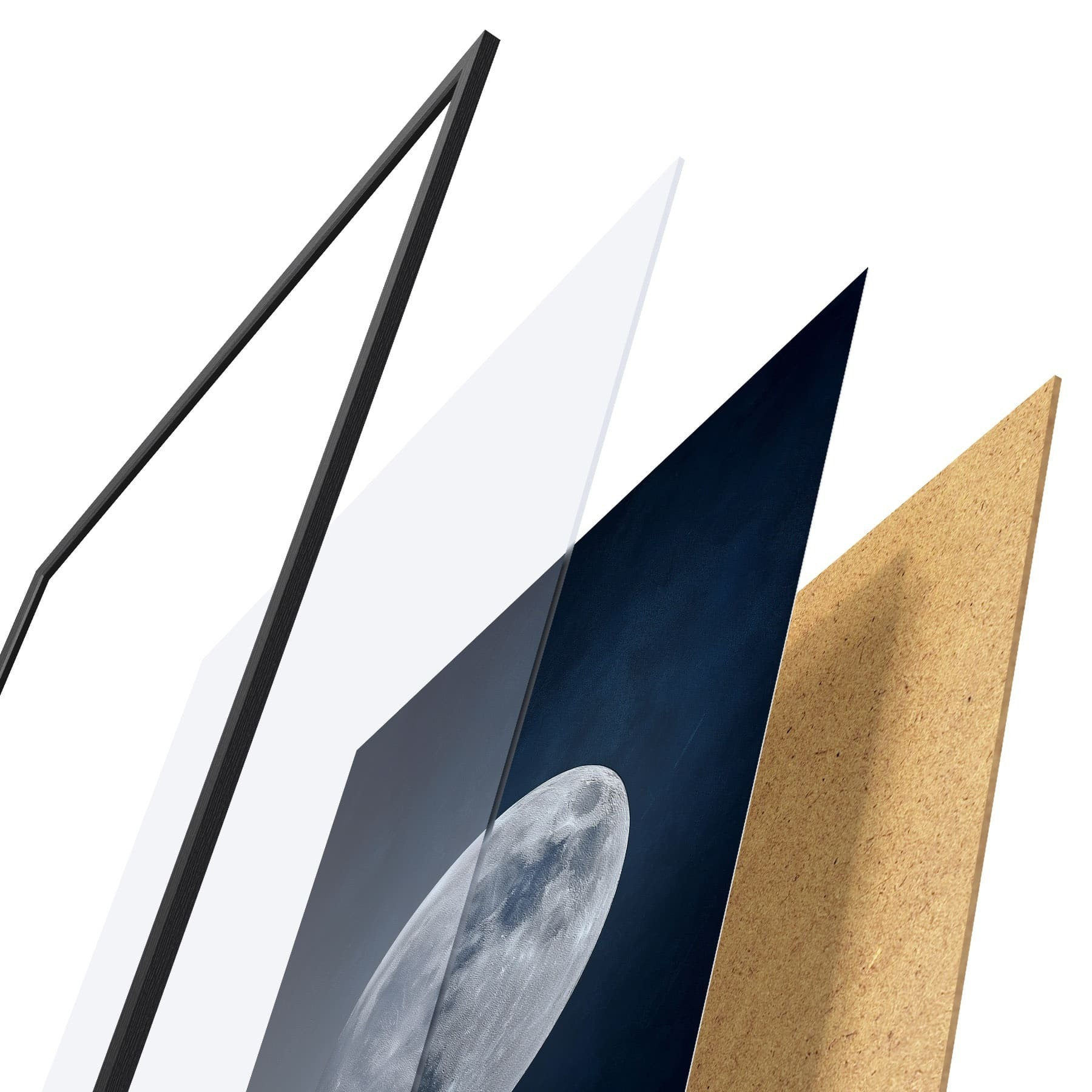 Das Poster besteht aus einem Rahmen, Plexiglas, einem gedruckten Bild und einer Rückwand aus Spanplatten. Dank der Halterungen auf der Rückseite kann das Poster sofort an die Wand gehängt werden.