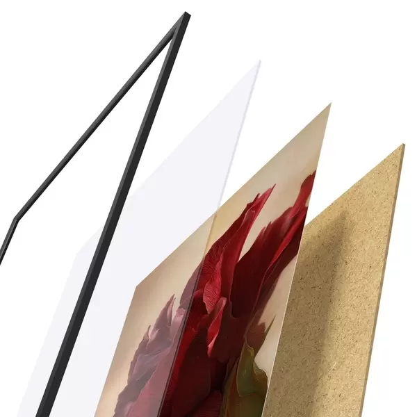 Das Poster besteht aus einem Rahmen, Plexiglas, einem gedruckten Bild und einer Rückwand aus Spanplatten. Dank der Halterungen auf der Rückseite kann das Poster sofort an die Wand gehängt werden.