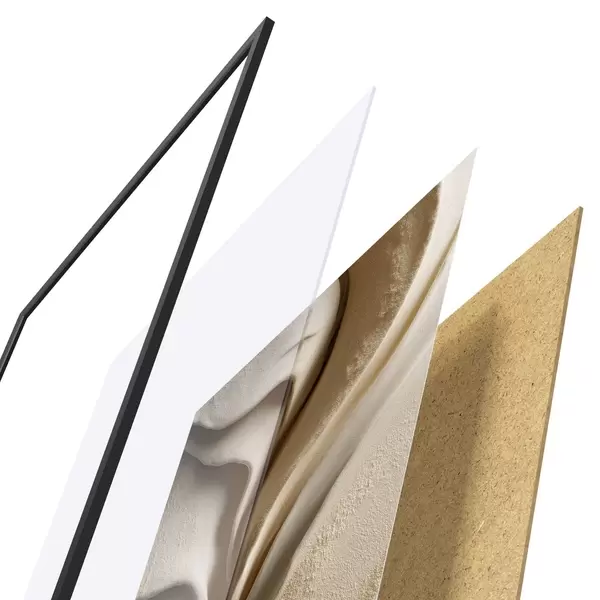 Das Poster besteht aus einem Rahmen, Plexiglas, einem gedruckten Bild und einer Rückwand aus Spanplatten. Dank der Halterungen auf der Rückseite kann das Poster sofort an die Wand gehängt werden.