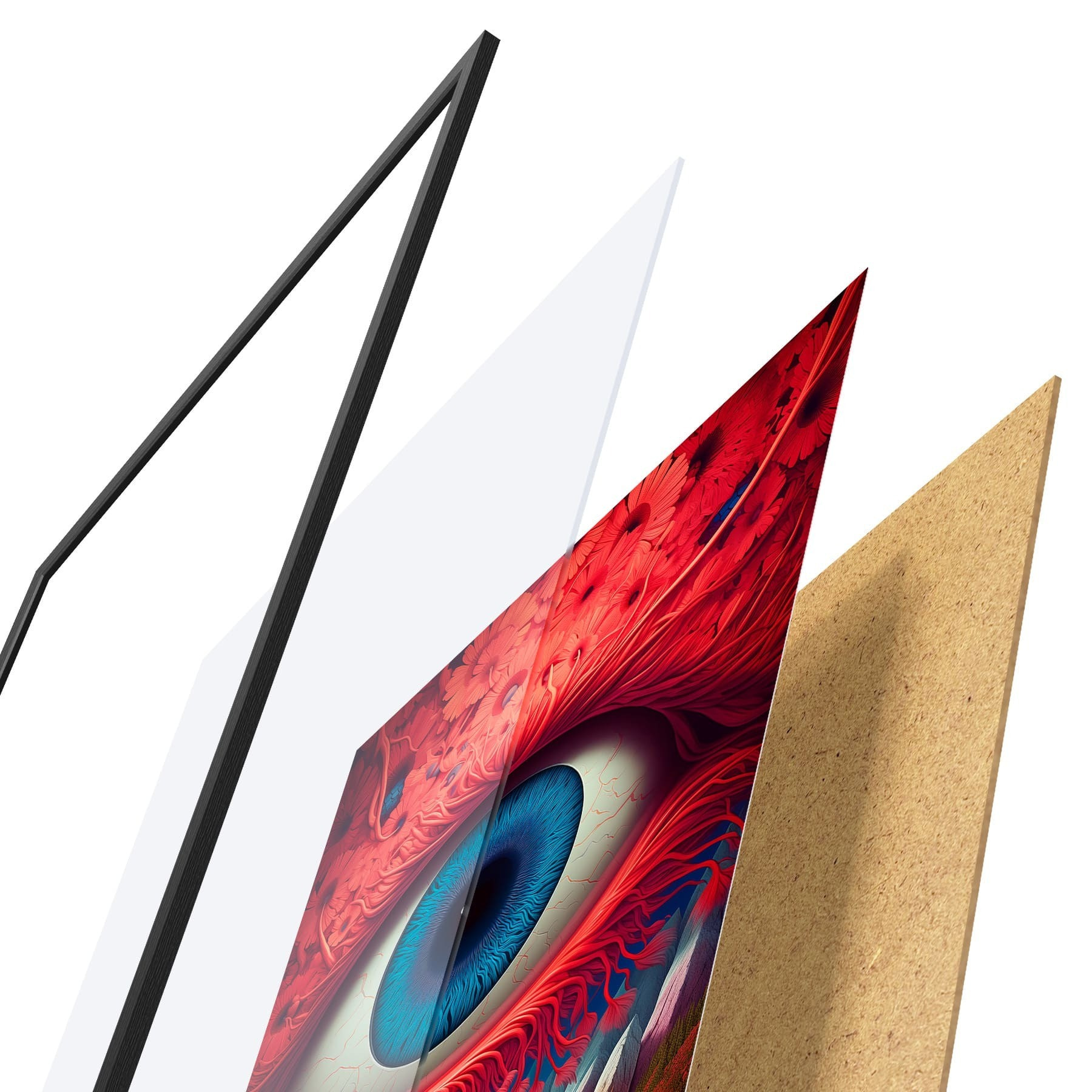 Das Poster besteht aus einem Rahmen, Plexiglas, einem gedruckten Bild und einer Rückwand aus Spanplatten. Dank der Halterungen auf der Rückseite kann das Poster sofort an die Wand gehängt werden.