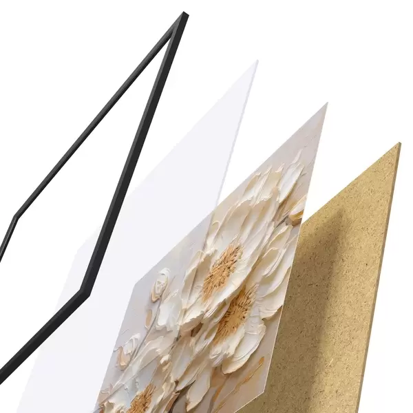 Das Poster besteht aus einem Rahmen, Plexiglas, einem gedruckten Bild und einer Rückwand aus Spanplatten. Dank der Halterungen auf der Rückseite kann das Poster sofort an die Wand gehängt werden.