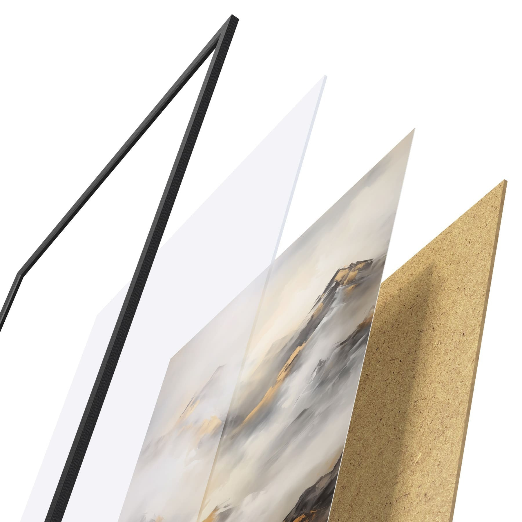 Das Poster besteht aus einem Rahmen, Plexiglas, einem gedruckten Bild und einer Rückwand aus Spanplatten. Dank der Halterungen auf der Rückseite kann das Poster sofort an die Wand gehängt werden.