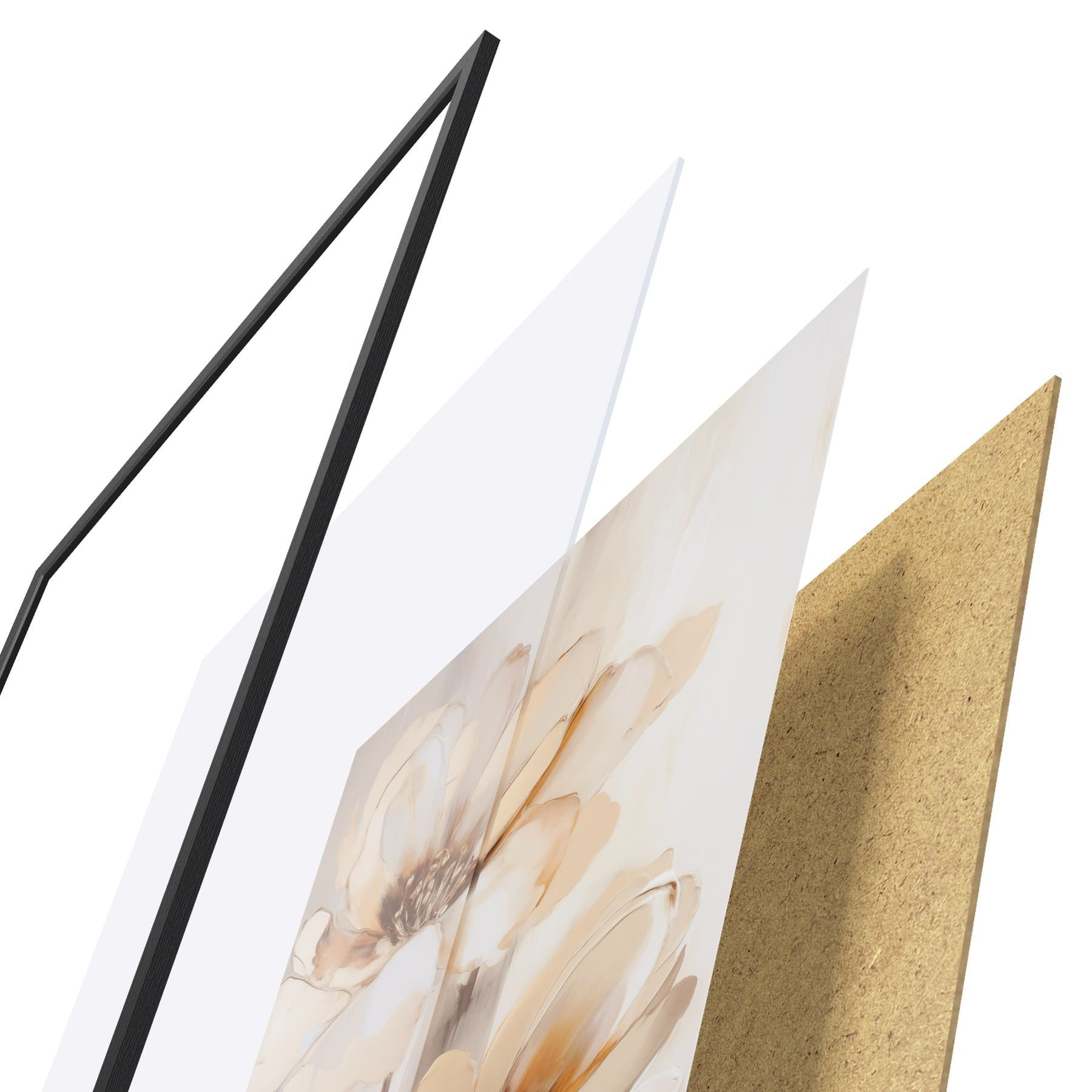 Das Poster besteht aus einem Rahmen, Plexiglas, einem gedruckten Bild und einer Rückwand aus Spanplatten. Dank der Halterungen auf der Rückseite kann das Poster sofort an die Wand gehängt werden.