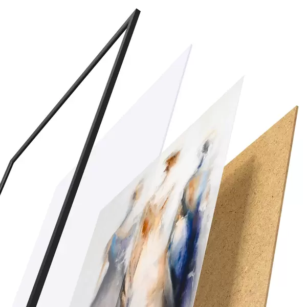 Das Poster besteht aus einem Rahmen, Plexiglas, einem gedruckten Bild und einer Rückwand aus Spanplatten. Dank der Halterungen auf der Rückseite kann das Poster sofort an die Wand gehängt werden.