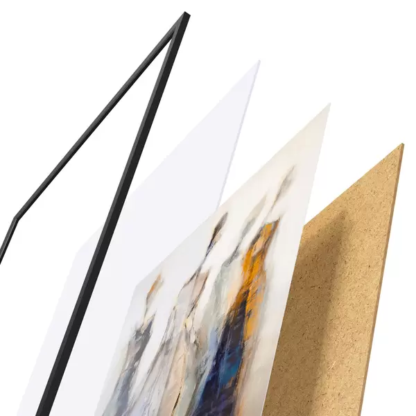 Das Poster besteht aus einem Rahmen, Plexiglas, einem gedruckten Bild und einer Rückwand aus Spanplatten. Dank der Halterungen auf der Rückseite kann das Poster sofort an die Wand gehängt werden.