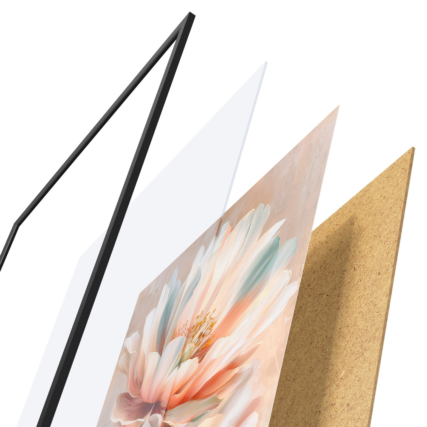 Das Poster besteht aus einem Rahmen, Plexiglas, einem gedruckten Bild und einer Rückwand aus Spanplatten. Dank der Halterungen auf der Rückseite kann das Poster sofort an die Wand gehängt werden.