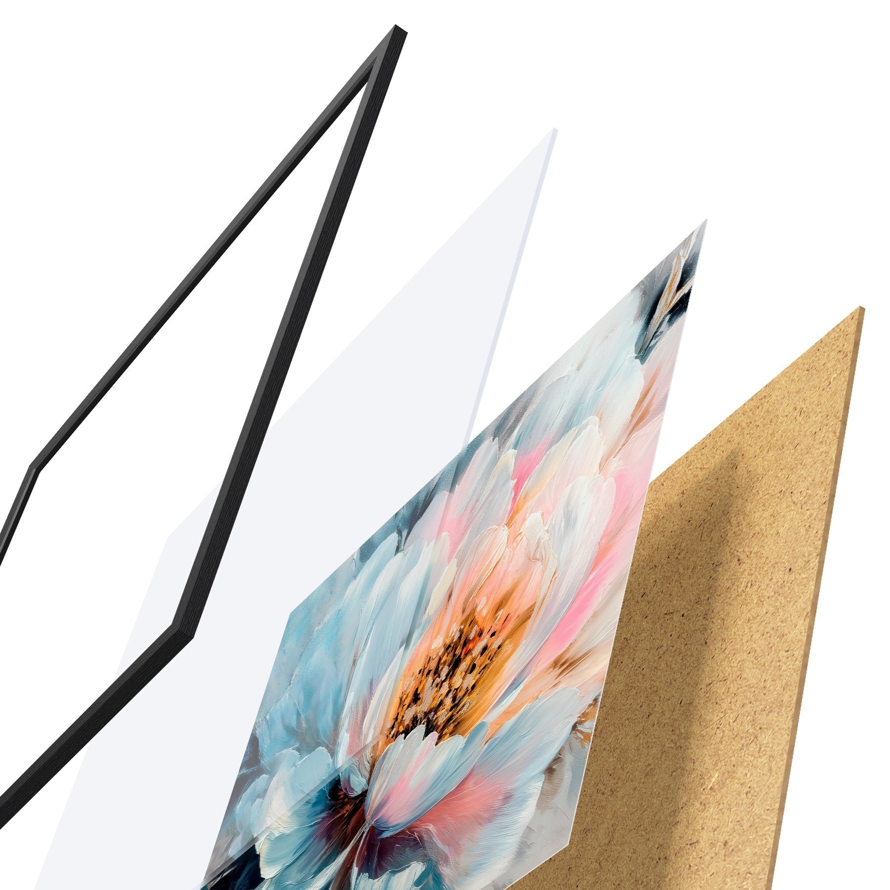 Das Poster besteht aus einem Rahmen, Plexiglas, einem gedruckten Bild und einer Rückwand aus Spanplatten. Dank der Halterungen auf der Rückseite kann das Poster sofort an die Wand gehängt werden.