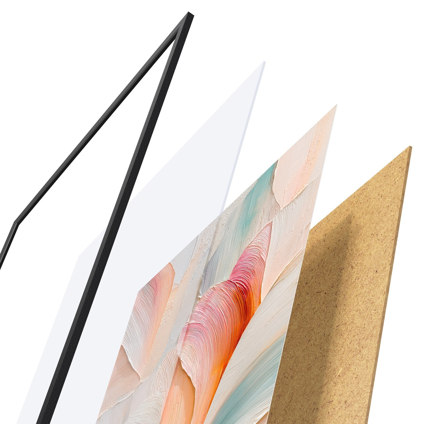 Das Poster besteht aus einem Rahmen, Plexiglas, einem gedruckten Bild und einer Rückwand aus Spanplatten. Dank der Halterungen auf der Rückseite kann das Poster sofort an die Wand gehängt werden.