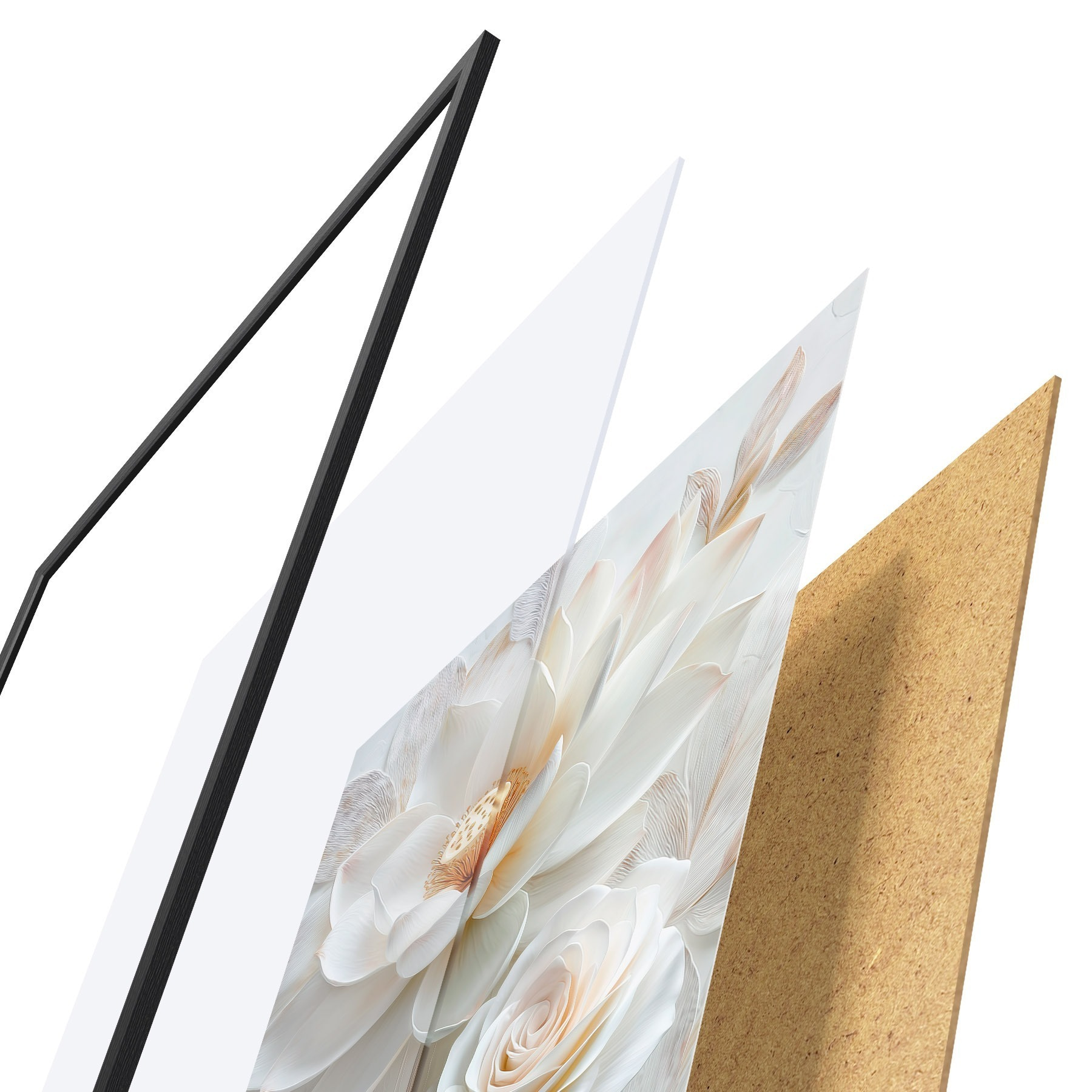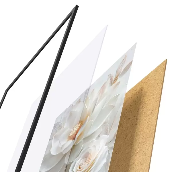 Das Poster besteht aus einem Rahmen, Plexiglas, einem gedruckten Bild und einer Rückwand aus Spanplatten. Dank der Halterungen auf der Rückseite kann das Poster sofort an die Wand gehängt werden.