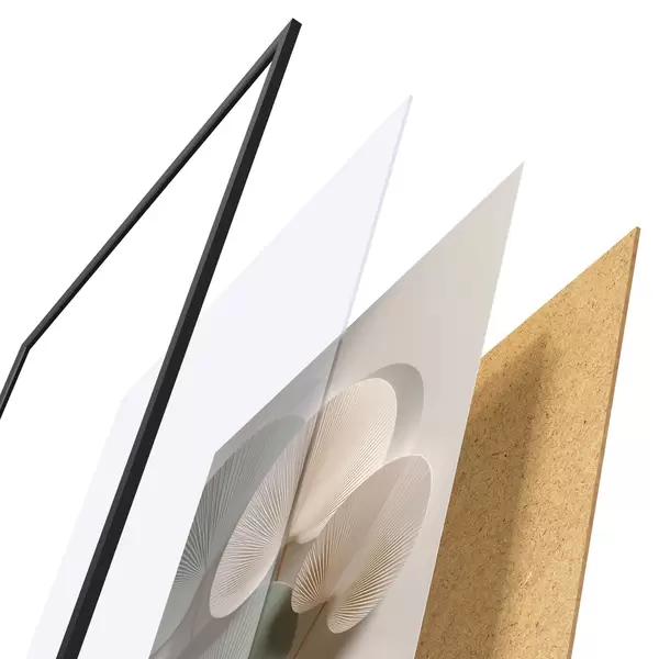 Das Poster besteht aus einem Rahmen, Plexiglas, einem gedruckten Bild und einer Rückwand aus Spanplatten. Dank der Halterungen auf der Rückseite kann das Poster sofort an die Wand gehängt werden.