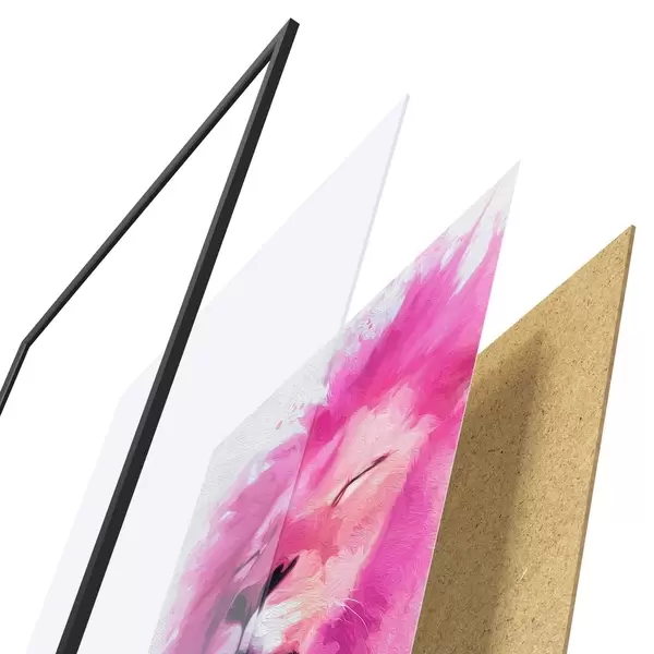 Das Poster besteht aus einem Rahmen, Plexiglas, einem gedruckten Bild und einer Rückwand aus Spanplatten. Dank der Halterungen auf der Rückseite kann das Poster sofort an die Wand gehängt werden.