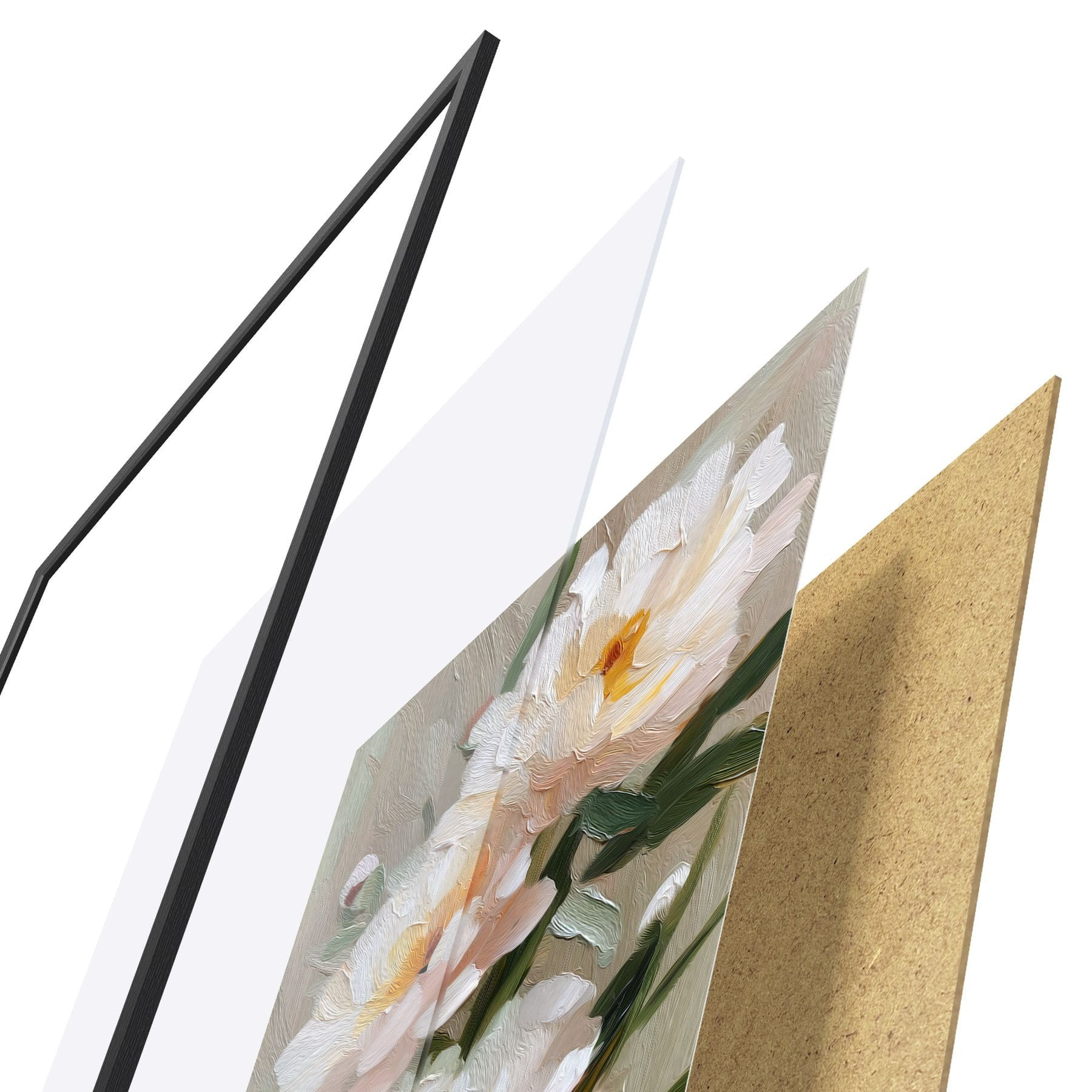 Das Poster besteht aus einem Rahmen, Plexiglas, einem gedruckten Bild und einer Rückwand aus Spanplatten. Dank der Halterungen auf der Rückseite kann das Poster sofort an die Wand gehängt werden.