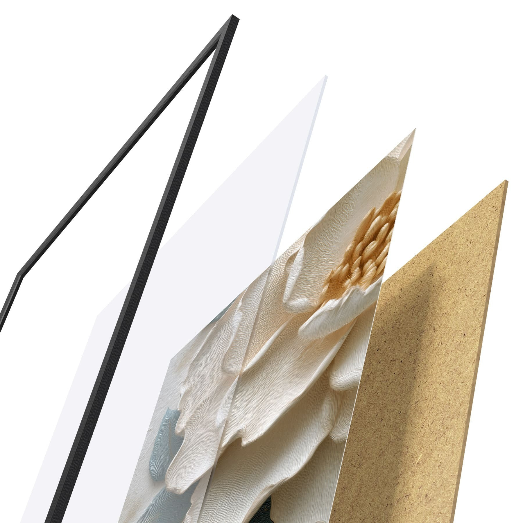 Das Poster besteht aus einem Rahmen, Plexiglas, einem gedruckten Bild und einer Rückwand aus Spanplatten. Dank der Halterungen auf der Rückseite kann das Poster sofort an die Wand gehängt werden.