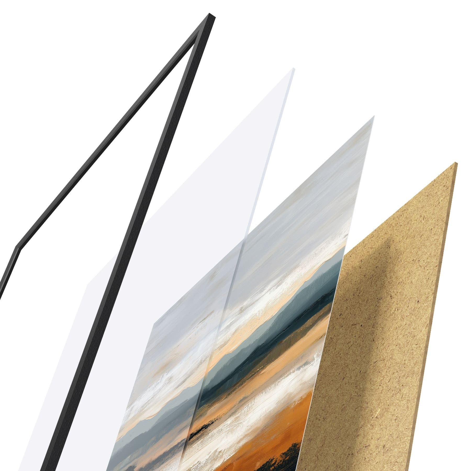 Das Poster besteht aus einem Rahmen, Plexiglas, einem gedruckten Bild und einer Rückwand aus Spanplatten. Dank der Halterungen auf der Rückseite kann das Poster sofort an die Wand gehängt werden.