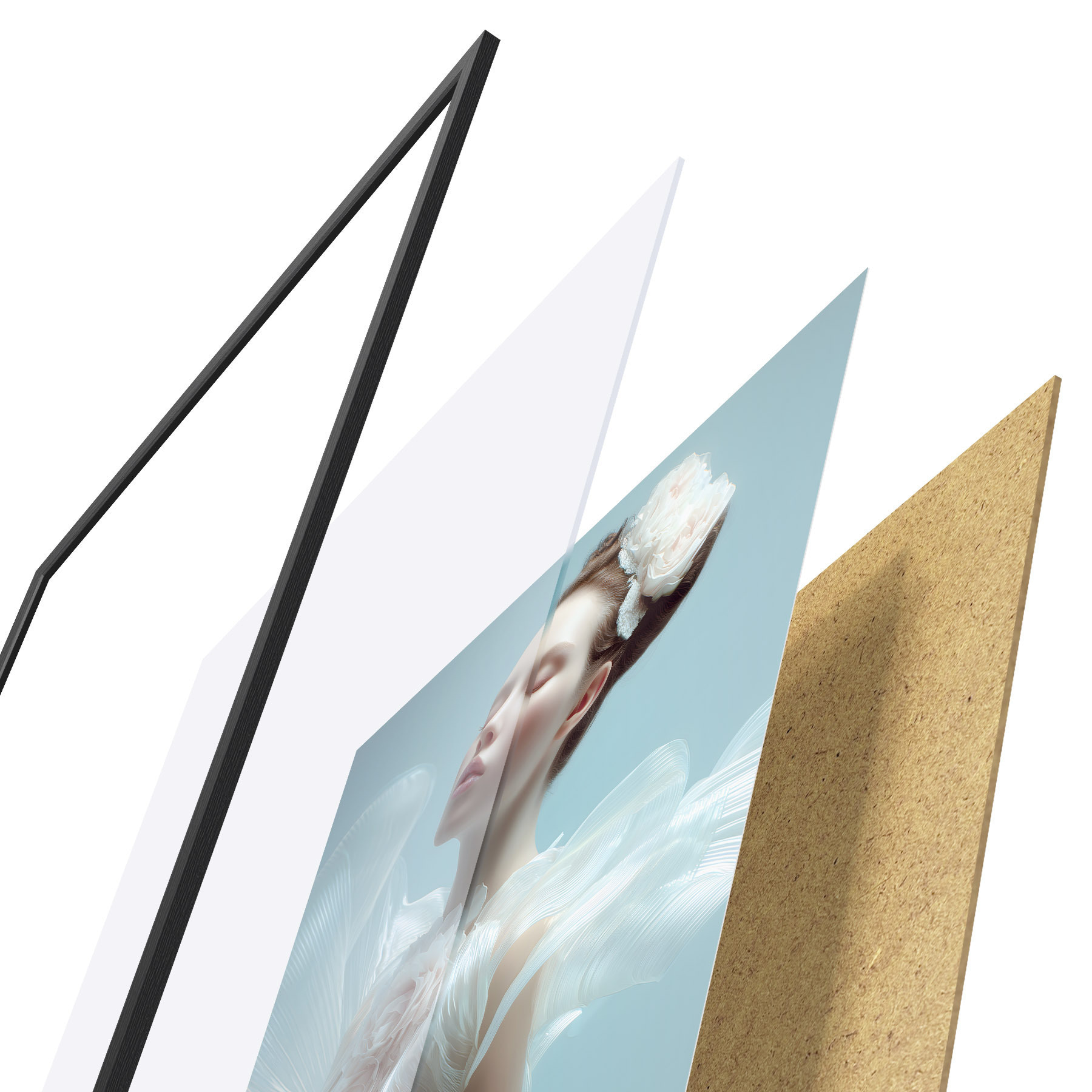 Das Poster besteht aus einem Rahmen, Plexiglas, einem gedruckten Bild und einer Rückwand aus Spanplatten. Dank der Halterungen auf der Rückseite kann das Poster sofort an die Wand gehängt werden.