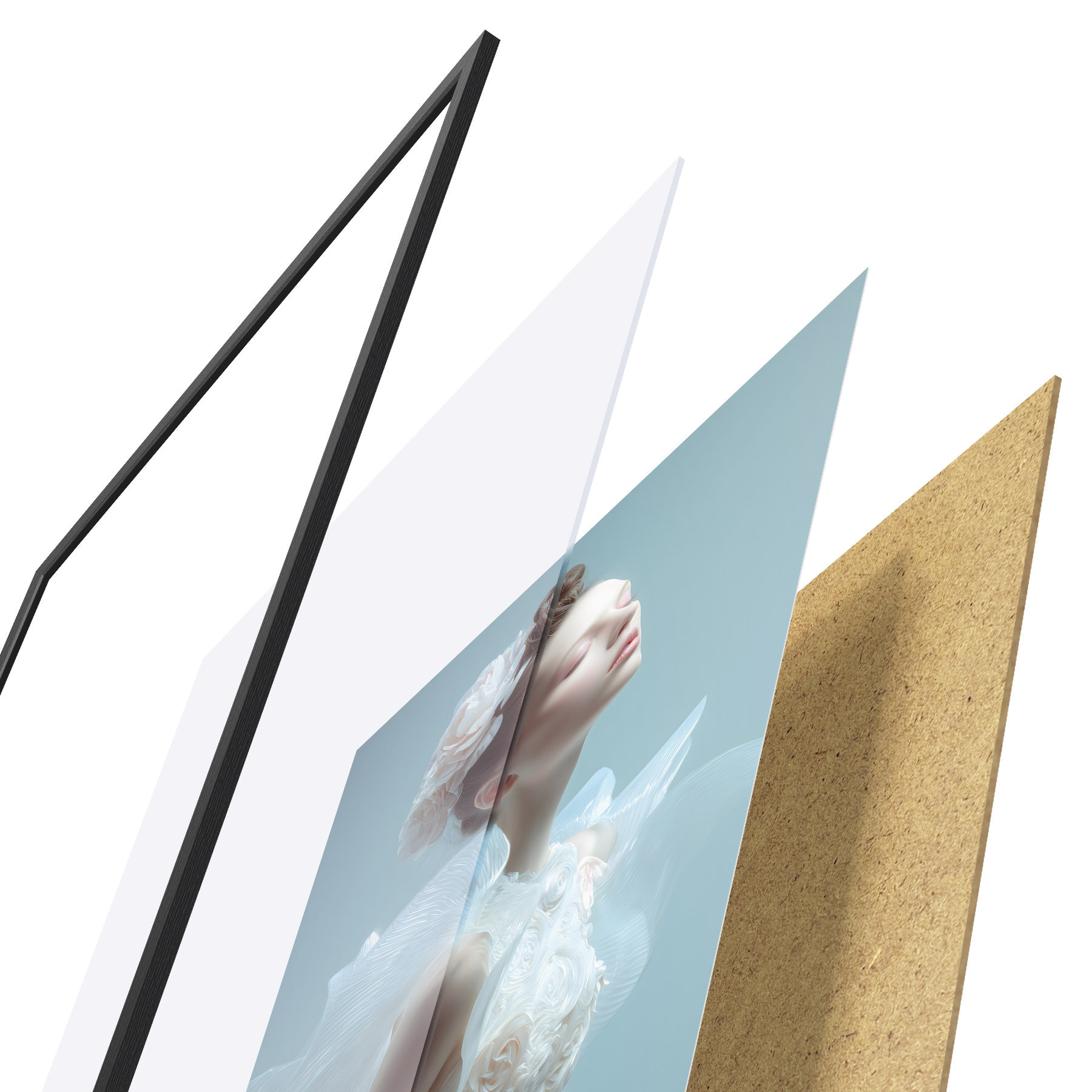 Das Poster besteht aus einem Rahmen, Plexiglas, einem gedruckten Bild und einer Rückwand aus Spanplatten. Dank der Halterungen auf der Rückseite kann das Poster sofort an die Wand gehängt werden.