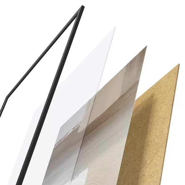 Das Poster besteht aus einem Rahmen, Plexiglas, einem gedruckten Bild und einer Rückwand aus Spanplatten. Dank der Halterungen auf der Rückseite kann das Poster sofort an die Wand gehängt werden.