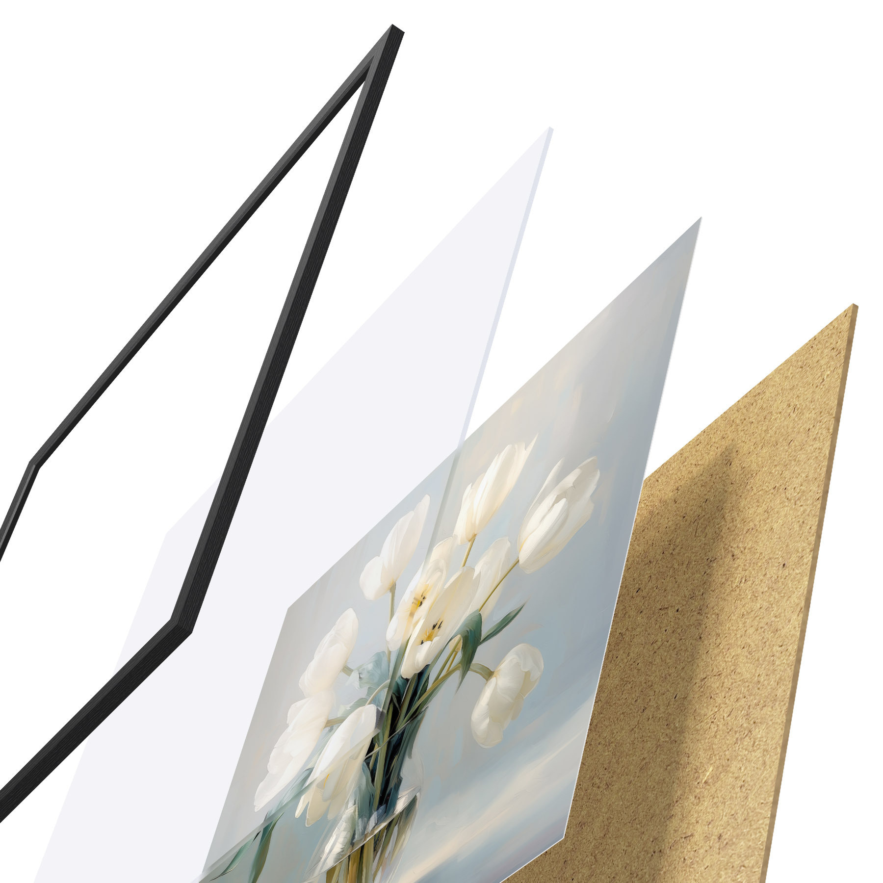 Das Poster besteht aus einem Rahmen, Plexiglas, einem gedruckten Bild und einer Rückwand aus Spanplatten. Dank der Halterungen auf der Rückseite kann das Poster sofort an die Wand gehängt werden.