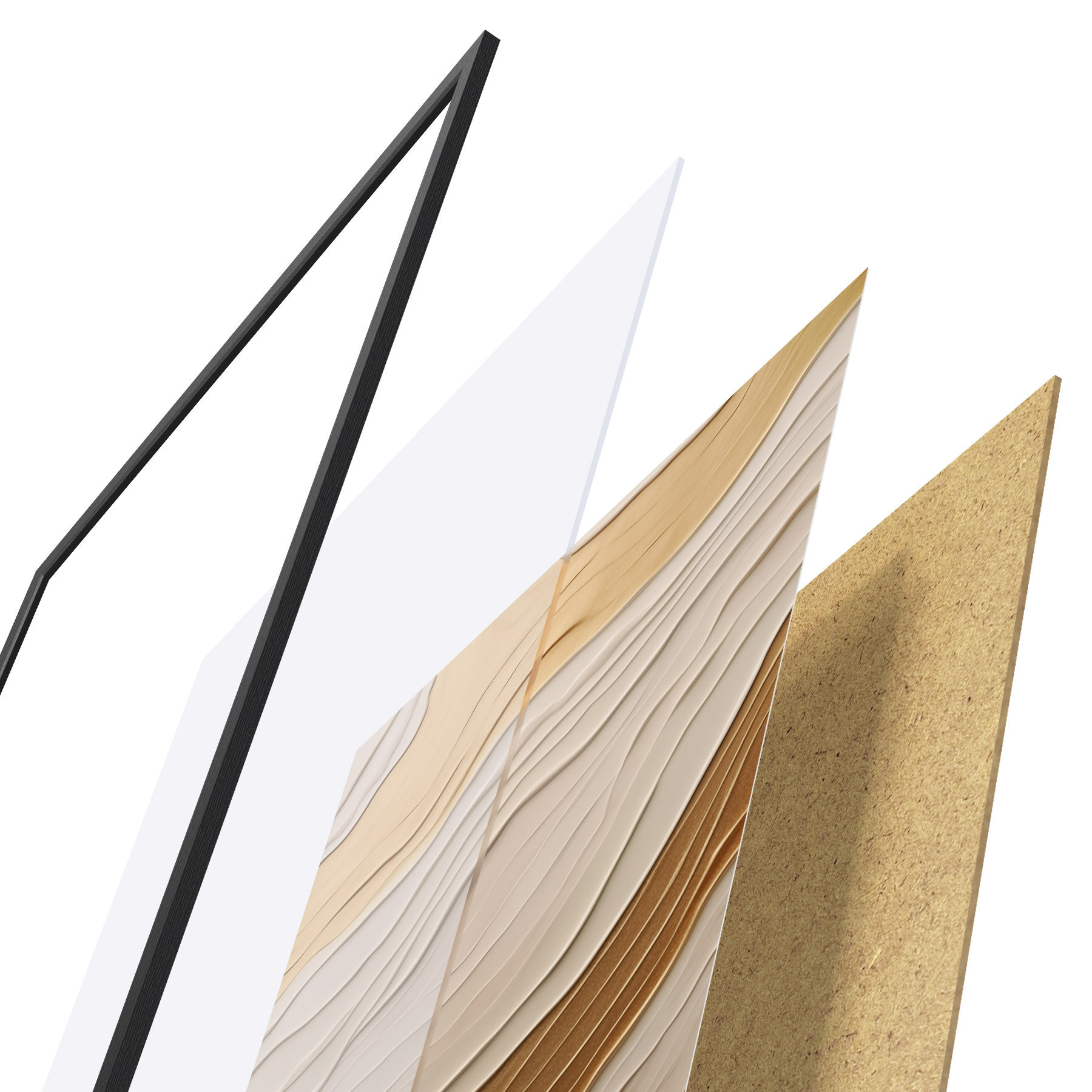 Das Poster besteht aus einem Rahmen, Plexiglas, einem gedruckten Bild und einer Rückwand aus Spanplatten. Dank der Halterungen auf der Rückseite kann das Poster sofort an die Wand gehängt werden.