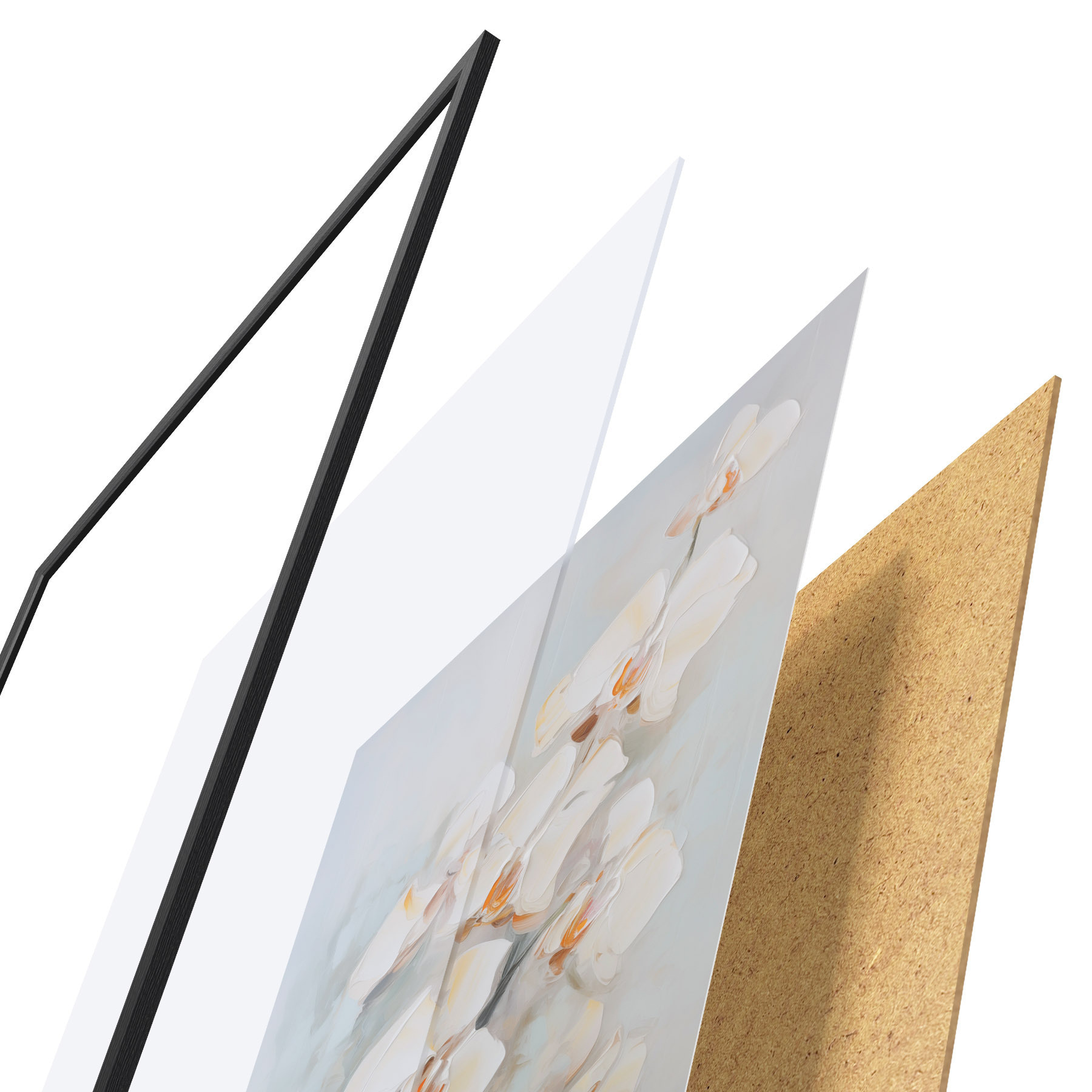 Das Poster besteht aus einem Rahmen, Plexiglas, einem gedruckten Bild und einer Rückwand aus Spanplatten. Dank der Halterungen auf der Rückseite kann das Poster sofort an die Wand gehängt werden.