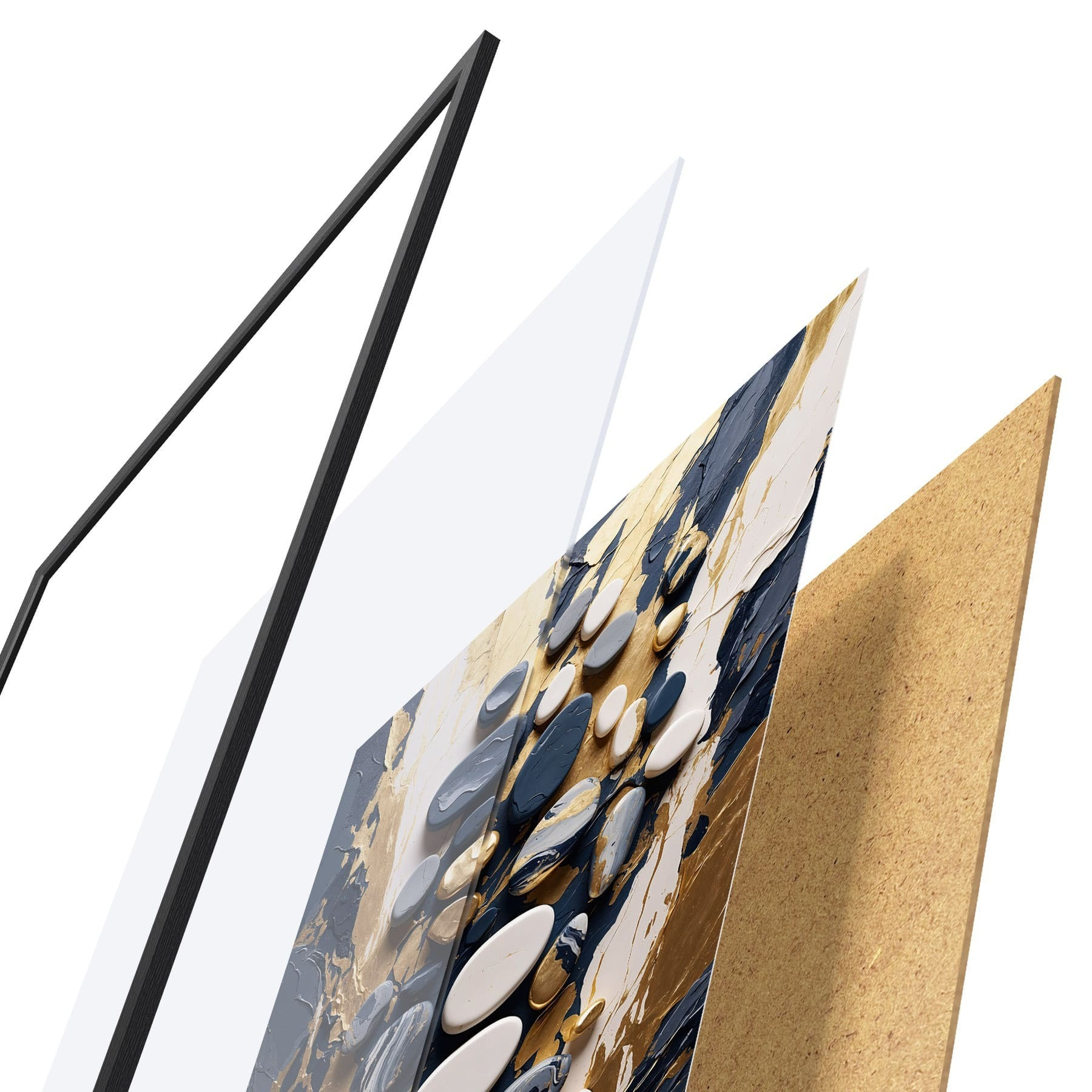 Das Poster besteht aus einem Rahmen, Plexiglas, einem gedruckten Bild und einer Rückwand aus Spanplatten. Dank der Halterungen auf der Rückseite kann das Poster sofort an die Wand gehängt werden.