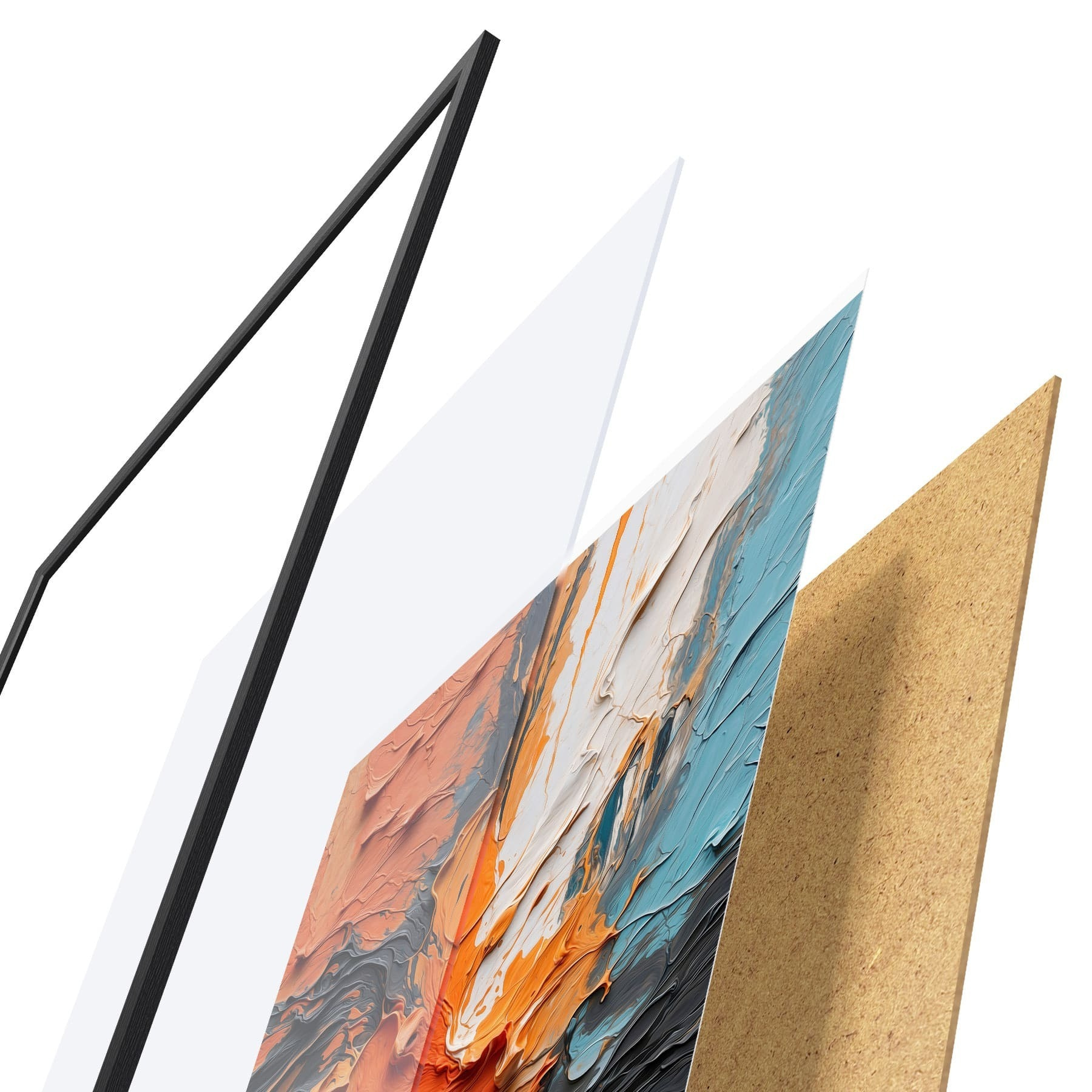 Das Poster besteht aus einem Rahmen, Plexiglas, einem gedruckten Bild und einer Rückwand aus Spanplatten. Dank der Halterungen auf der Rückseite kann das Poster sofort an die Wand gehängt werden.