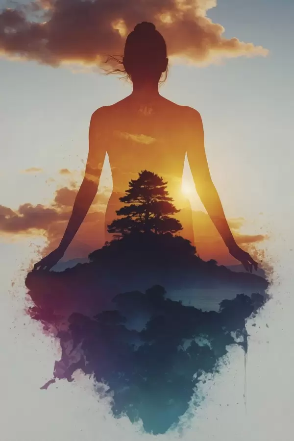 Poster Menschliche Silhouette vor einer Landschaft bei Sonnenuntergang Nr f48364