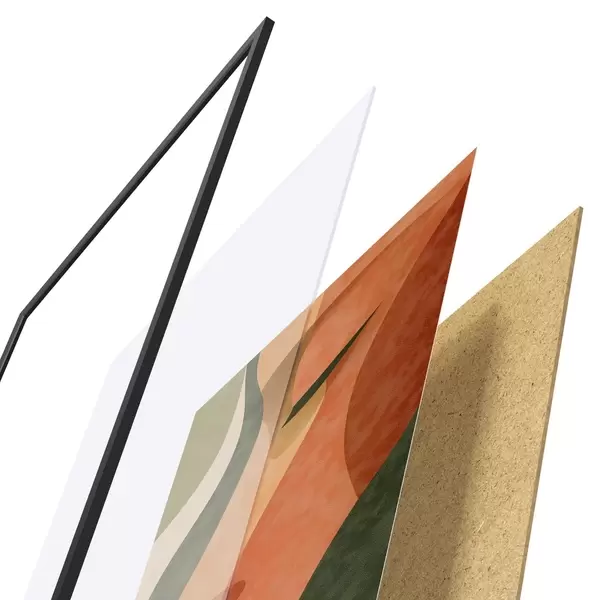 Das Poster besteht aus einem Rahmen, Plexiglas, einem gedruckten Bild und einer Rückwand aus Spanplatten. Dank der Halterungen auf der Rückseite kann das Poster sofort an die Wand gehängt werden.