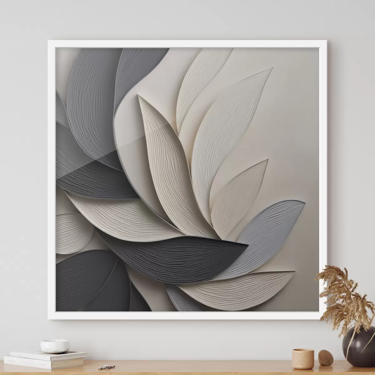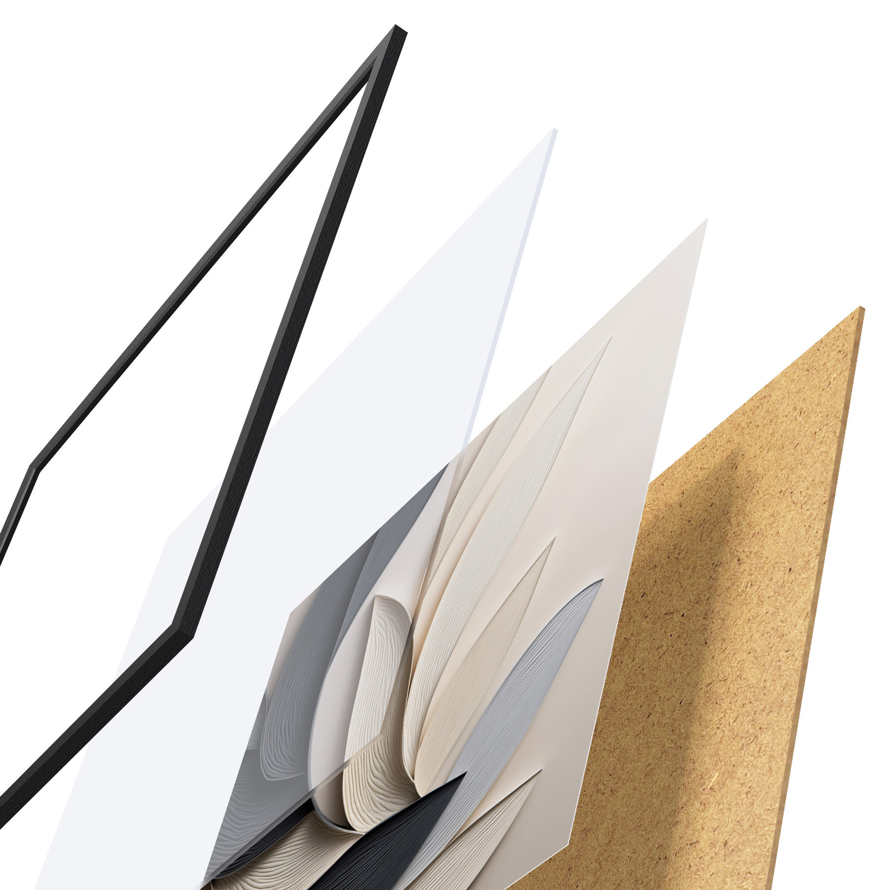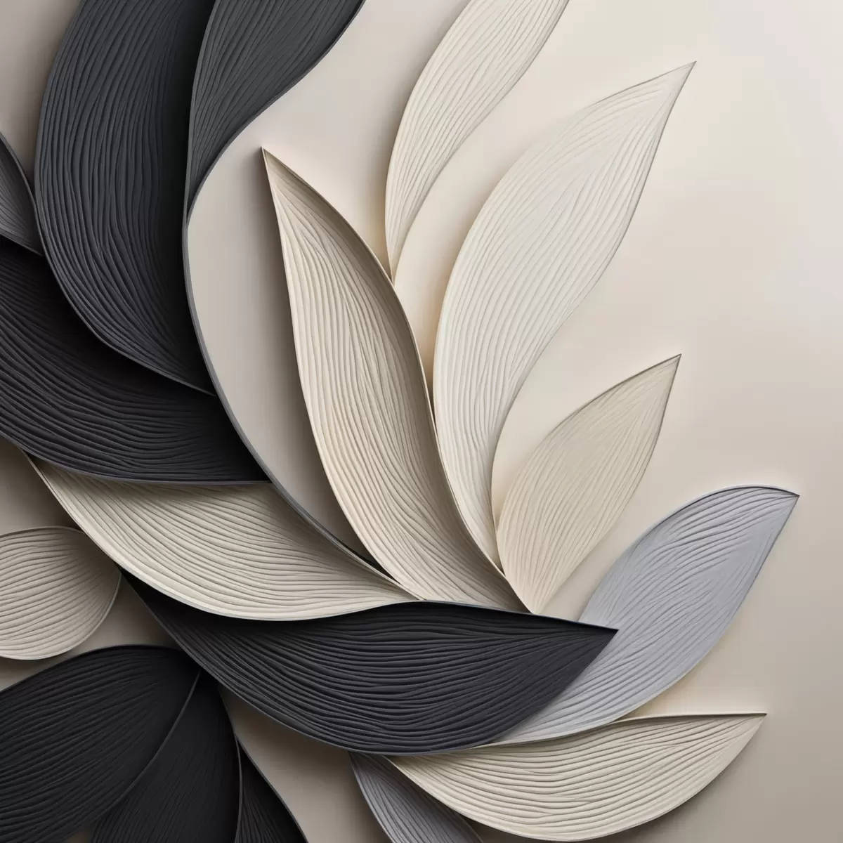 Poster Abstrakte Komposition aus übereinanderliegenden Blättern, geschwungenen Formen in Schwarz, Weiß und Beige, strukturierte Kunst f48381