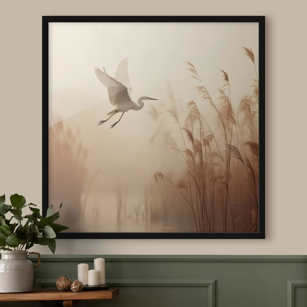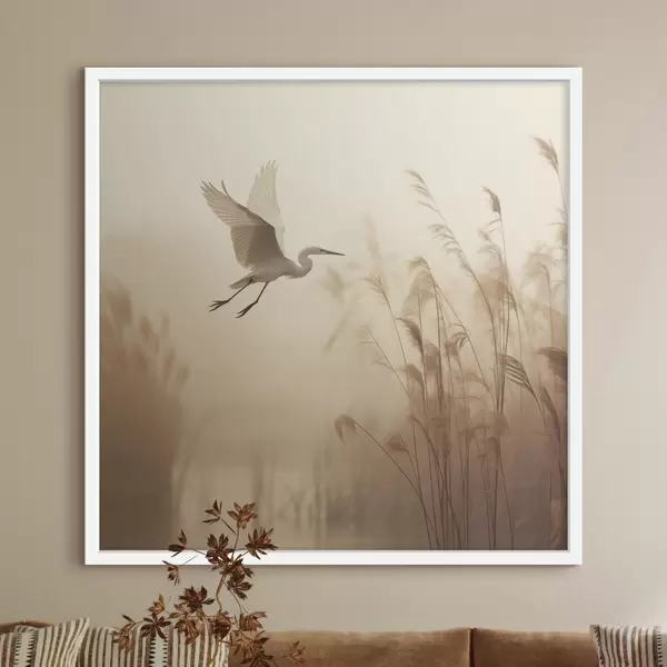 Poster Ein Silberreiher fliegt über einen See, umgeben von hohem Schilf und Bäumen im Hintergrund Nr f48390